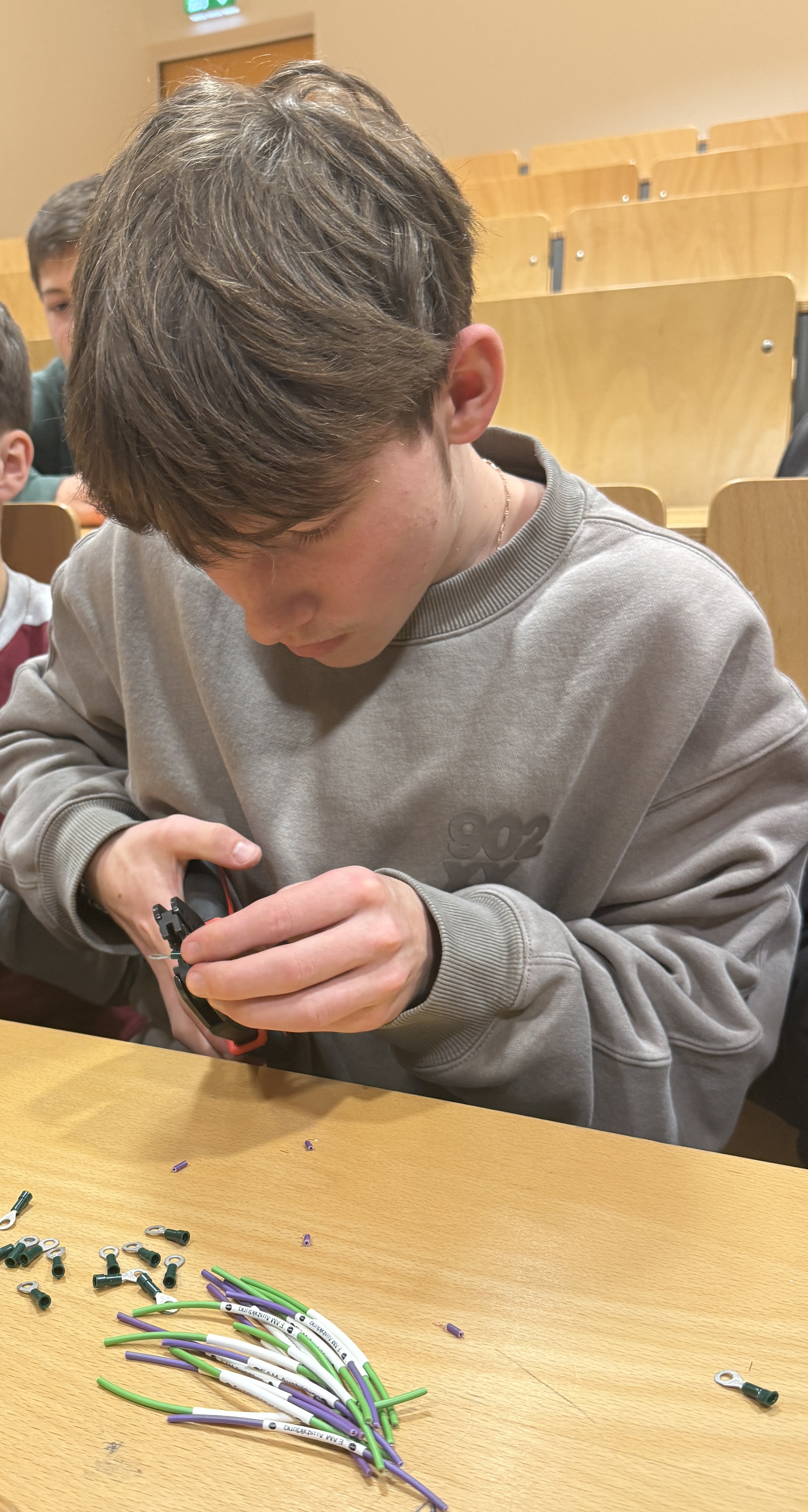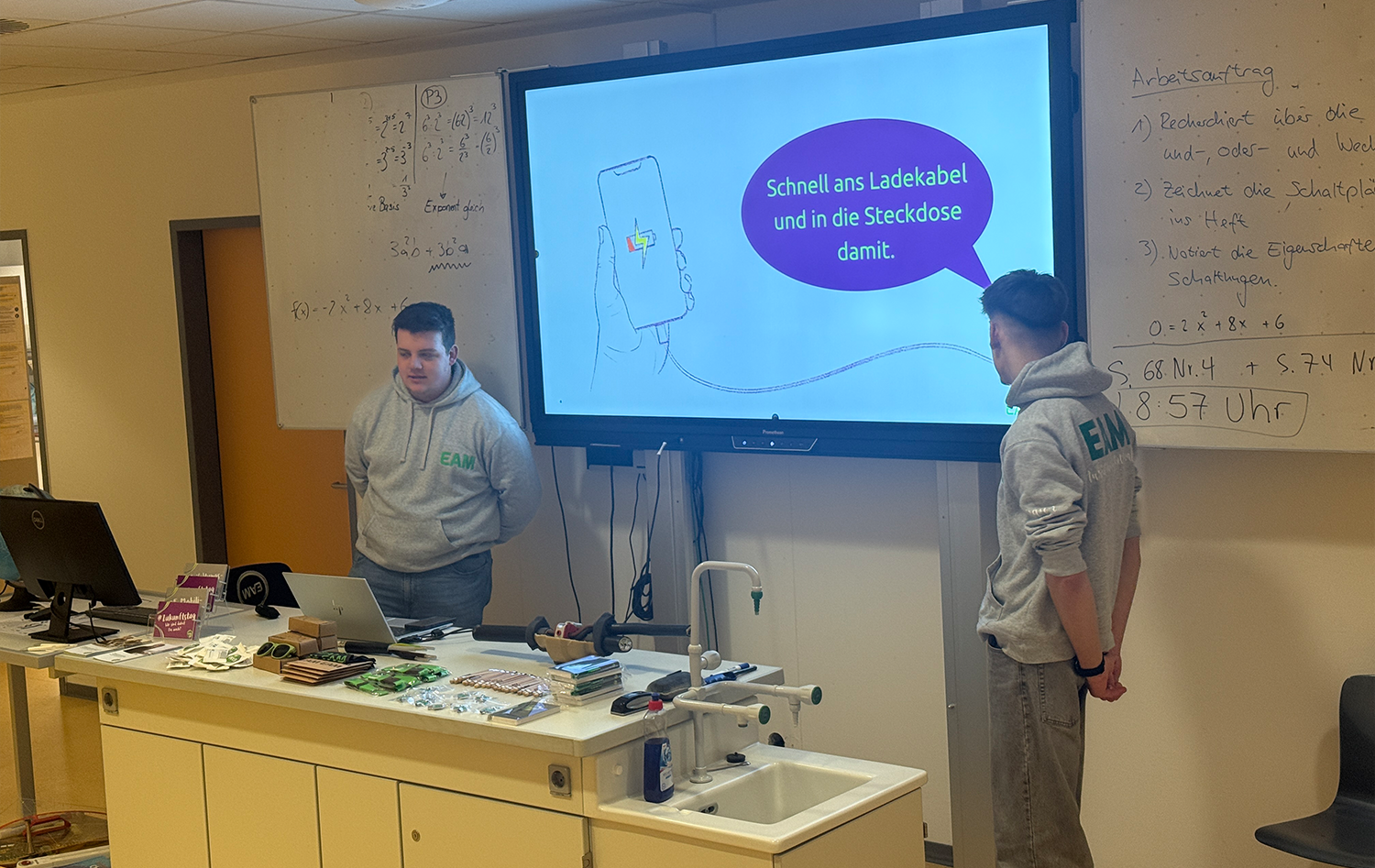 Einen Tag später fand zudem an der LTS Lahnau ein Workshop der Firma EAM statt, welche im Rahmen von „I am MINT“ zwei Auszubildende an die Integrierte Gesamtschule sandte. Diese stellten die Ausbildungsmöglichkeiten im Bereich der Elektrotechnik vor und gingen anschließend mit den Jugendlichen in eine Praxisteil über. Hier konnten die Schülerinnen und Schüler Steckübungen von Parallelschaltungen testen sowie Schlüsselanhänger aus Kabeln herstellen